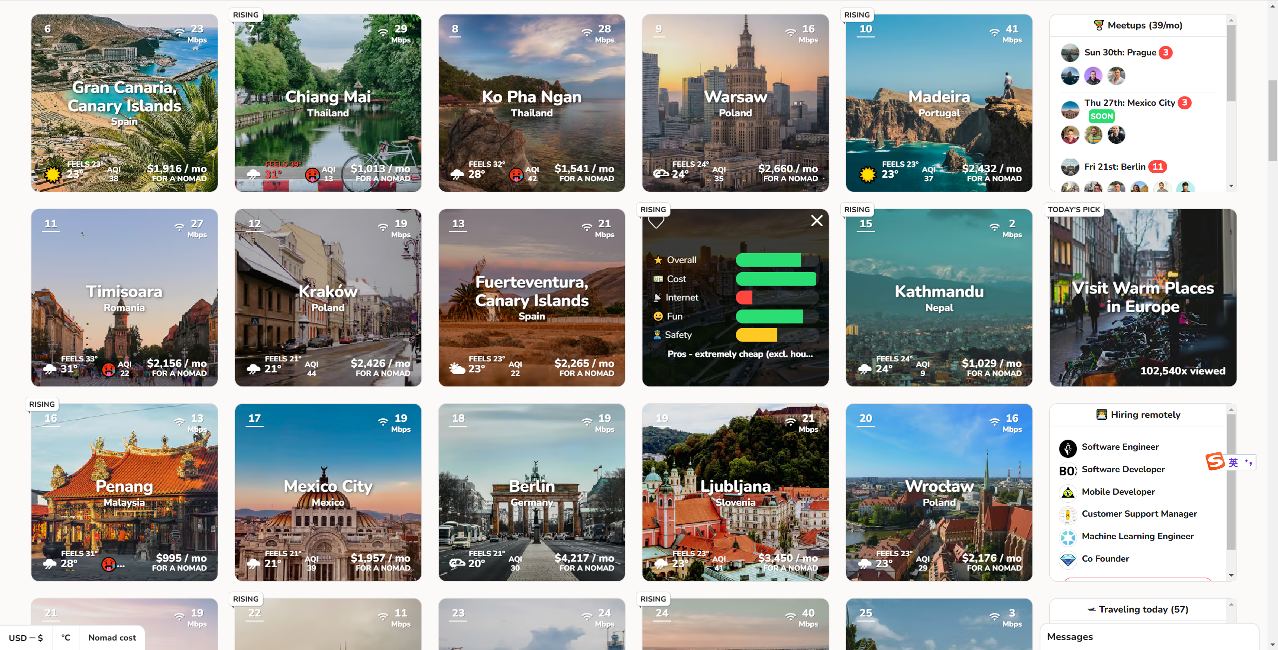 数字游民宜居地 网站「Nomad List」,收集和展示了数千个城市的数字游民指数,包括成本、网络速度、生活质量等,你可以探索到一个最适合工作和生活的地方,并与社区里的同学交流经验和建议,网站本身做得也很不错,收藏备用一下。